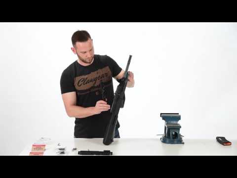 Assurez-vous que votre arme est déchargée et en sécurité. Prenez la demi-coque gauche (celle sans rail supérieur) et placez-la sur la lunette en la poussant sur la vis de fixation diagonale de la lunette.